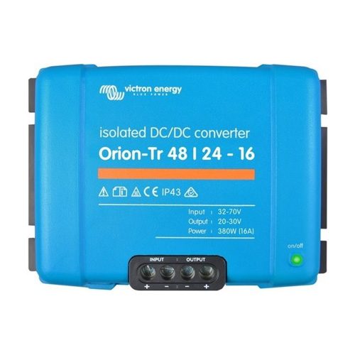 Con una eficiencia de hasta el 96%, el Orion-Tr 48/24-16A asegura una conversión de energía óptima, reduciendo al mínimo las pérdidas de energía. Es perfecto para sistemas de 48V como los utilizados en vehículos eléctricos, sistemas solares o aplicaciones industriales, permitiendo alimentar equipos de 24V de manera confiable.